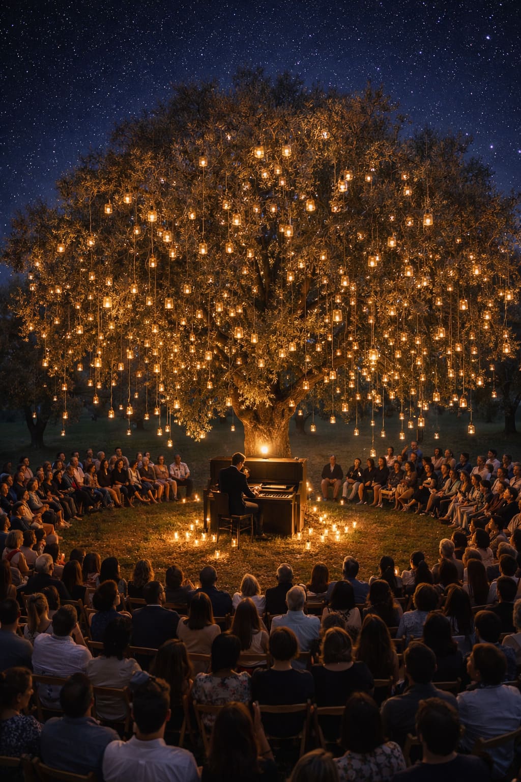 Under the magic of a centuries-old tree, in the heart of the forest, a unique experience is born: a piano surrounded by 200 candles, delicately suspended among its branches, creating an intimate and enveloping atmosphere.