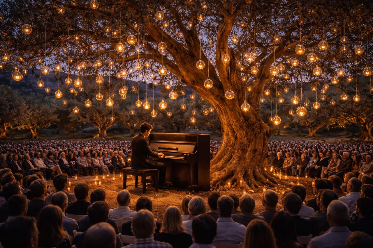 Under the magic of a centuries-old tree, in the heart of the forest, a unique experience is born: a piano surrounded by 200 candles, delicately suspended among its branches, creating an intimate and enveloping atmosphere.